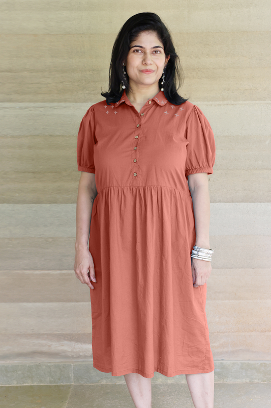 Collared Fine Cotton Navy Blue Dress with Embroidery