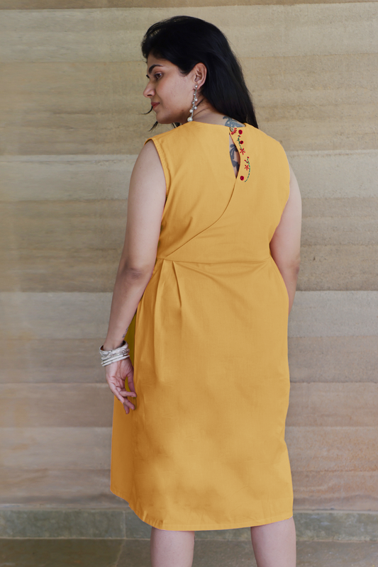 Round Neck Sleeveless Pleated Ochre Yellow Dress with Embroidery
