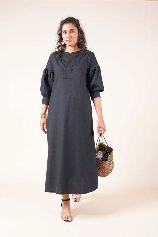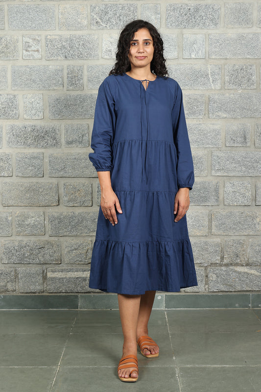 Collared Fine Cotton Navy Blue Dress with Embroidery