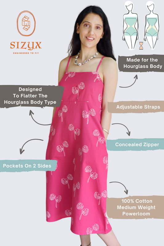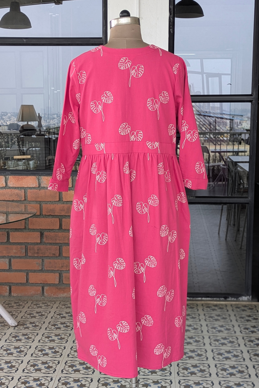 Kora and Viva Magenta Printed Midi Dress with a Triangle Cut on the Sleeve Cuff