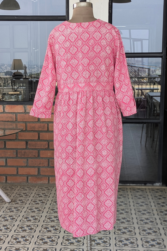 Pink and Kora Printed Midi Dress with a Triangle Cut on the Sleeve Cuff